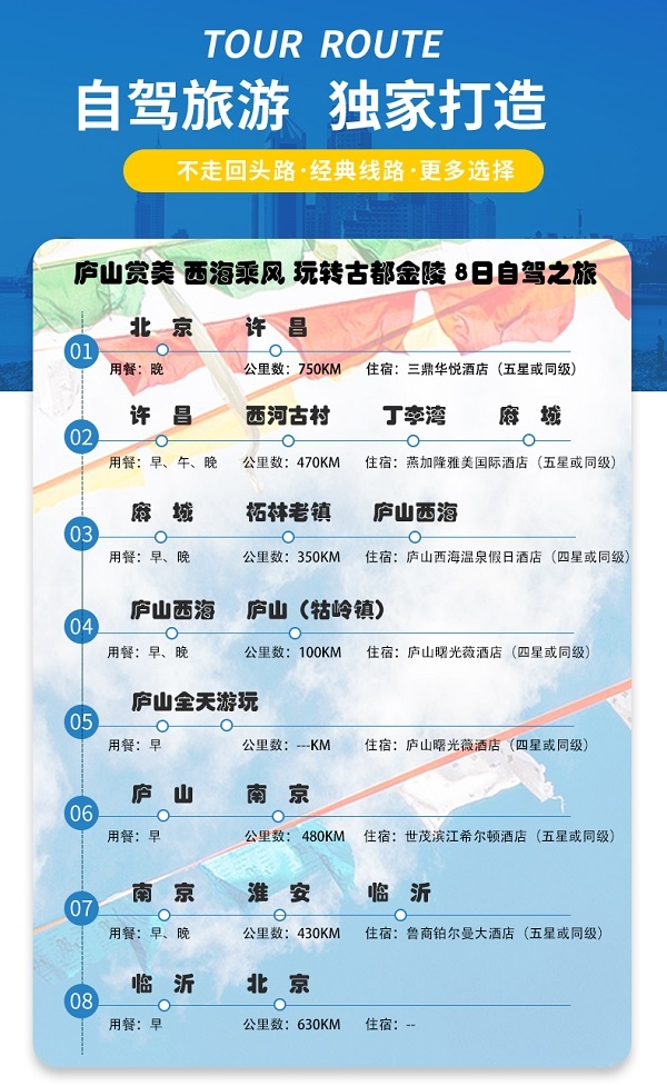 品味酒店早餐或睡到自然醒,指定时间车队集合出发,前往庐山。庐山的游览路线及景观众多,我们将入住庐山中的牯岭镇(计划车辆可以预约进入景区内,根据实际情况可能会做调整),抵达酒店入住后,充裕的时间畅游庐山,感受由古至今备受文人游客推崇的庐山盛景。(领队会根据您的身体疲劳程度及景区内的游览路线为您精心推荐)指定时间晚餐。
